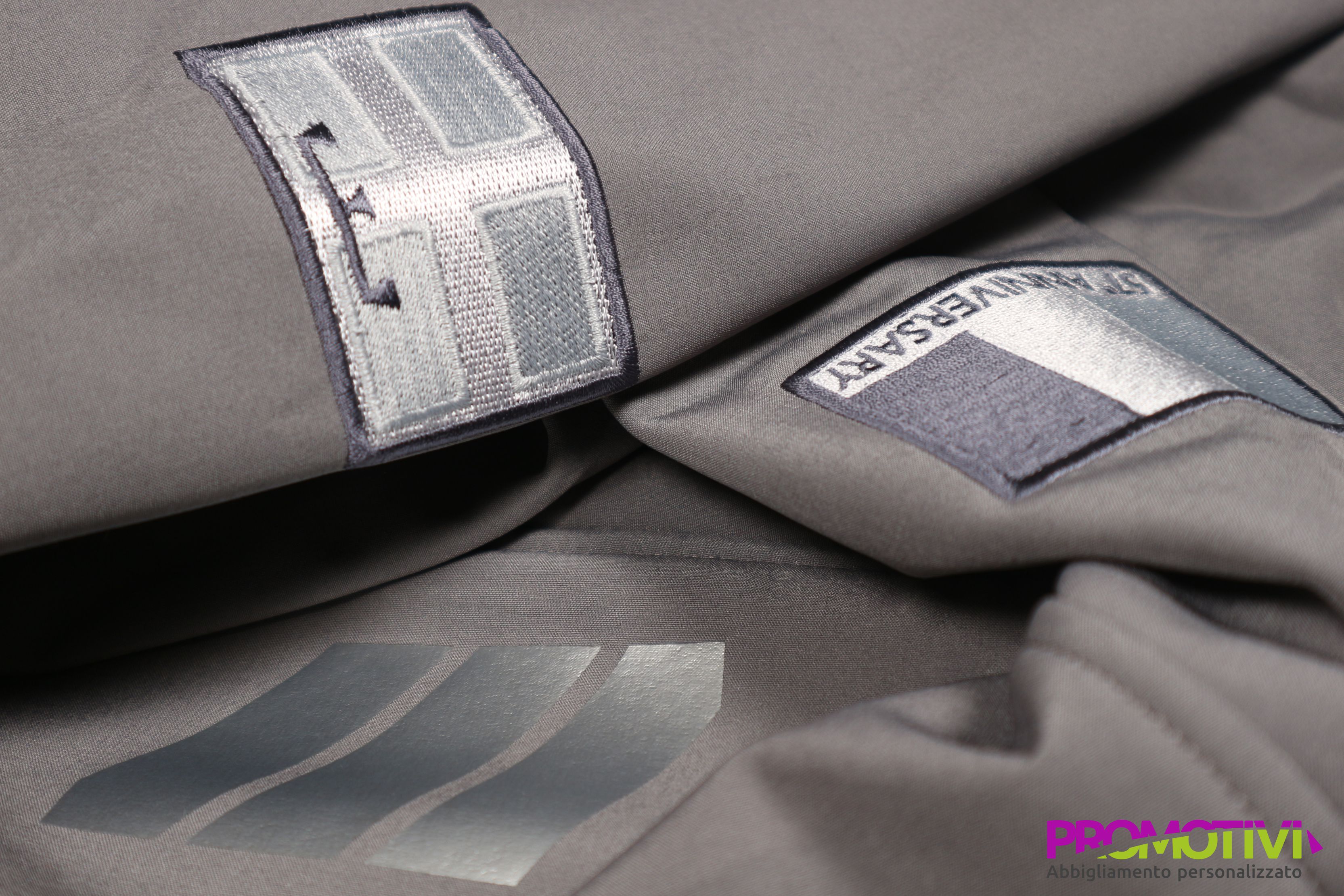 Una giacca in softshell bicolore dal tessuto resistente e antivento, personalizzato con ricami e stampe argentate dei loghi aziendali.